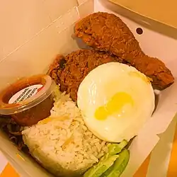 McDonald's fried chicken, McRice, and fruit tea are sold together as PaNas (paket nasi or "rice package") with an additional sachet of sambal chili sauce.[19] This adopts the Indonesian way of consuming ayam goreng (fried chicken) with steamed rice and sambal.