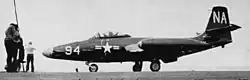 On 11 January 1947, the first prototype performed its maiden flight from Lambert Field, St. Louis, Missouri, piloted by McDonnell test pilot Robert M. Eldholm.[6] During this first test flight, the aircraft demonstrated a climb rate of 9,000 ft/min (2,700 m/min), twice that of the F8F Bearcat, the Navy's primary fleet defense interceptor.[7] The flight test programme, which included carrier trials, was considered to be a success, however, various improvements and refinements to the aircraft were suggested. The U.S. Navy also permitted McDonnell to borrow one of the prototypes to assist in the development of afterburners and to test fly a modified wing design with an extended trailing edge.[6]