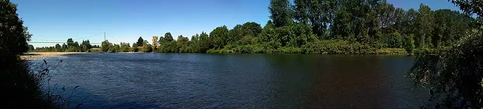 The McKenzie River is a 90-mile (145 km) tributary of the Willamette River in western Oregon in the United States. It drains part of the Cascade Range east of Eugene and flows westward into the southernmost end of the Willamette Valley. It is named for Donald McKenzie, a Scottish Canadian fur trader who explored parts of the Pacific Northwest for the Pacific Fur Company in the early 19th century.[6][7][8] As of the 21st century, six large dams have been built on the McKenzie and its tributaries.[9]