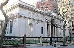 The firm retained its name long after the deaths of the founders. White was murdered in 1906, McKim died in 1909 and Mead retired in 1919. Kendall and Richardson divided most design responsibilities while Fenner took on the role of chief executive.[18] Architectural historian Mosette Broderick described the design partners thusly: Kendall as "hardworking, dull and mean," Richardson as "the best designer of the three."[19] This summation of Kendall's design skills is contradicted by his buildings, such as the Butler Institute of American Art (1919); his contemporaries considered him scholarly in the way that McKim had been.[20] The recollections of employees such as Royal Cortissoz, however, confirm that his behavior towards his colleagues and subordinates could be actively malicious.[21] Leland M. Roth identified the Racquet and Tennis Club (1918), designed by Richardson, as "the last and best work" of the decade following McKim and White's deaths. Richardson here combined Italian Renaissance precedents, such as the Florentine Palazzo Antinori, with modern functionalism.[22] The final two partners, Lawrence Grant White (1887 – 1956)–Stanford White's son–and James Kellum Smith (1893 – 1961), were admitted to the partnership in 1920 and 1929, respectively.[23] In its later years the firm maintained its commitment to quality materials and workmanship, but without its earlier creative abilities. In prior years the firm had been unfairly accused of being a "plan factory," a firm which executed generic, repetitive work as quickly as possible, but after about 1920 the comparison came to be seen as apt.[24][25]