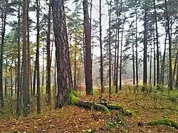 The park's green territory is covered by two overlapping protected conserved biotopes - old natural boreal forests (9010[13]) and forested coastal dunes (2180[14]).[2] The forested coastal dunes cover all of the territory, notably north side and along Kisezers coastline. These dunes are prone to eutrophication and succession The boreal forest covers 185 ha. It also susceptible to eutrophication with vegetation characteristic of more "fruitful" forest biomes In paces, uncharacteristic species of trees grow in the forest like maple, tilia, aspen, as well as foreign species - Weymouth pine, European larch, northern red oak) that were both planted and self-planted. There are various protected plant species, such as Pulsatilla pratensis, Platanthera bifolia, or Lycopodium annotinum.[2] Other vegetations includes various bushes and a few summer flowers, and few wintering species.[6]