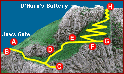 A.Jews Gate B.Levant Battery C.Martin's Cave D.Goat's Hair Twin Caves E.Tunnel and Pumping Station F.WW2 Observation Posts G.View point H.Lord Airey's Battery Top of Steps