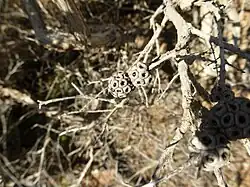The flowers are arranged in almost spherical heads up to 23 mm (0.9 in) in diameter. The heads are on the ends of branches which continue to grow after flowering, and often also in upper leaf axils. Each head contains 6 to 13 groups of flowers in threes. The petals are 1.7–2.5 mm (0.07–0.1 in) long and fall off as the flower opens. The stamens are purple, pink or mauve with golden tips and are arranged in five bundles around the flower, each bundle containing 7 to 11 stamens. Flowering occurs in late spring to summer and the fruit that follow are woody capsules in tight, almost spherical clusters up to 14 mm (0.6 in) in diameter appearing like miniature footballs.[3][4][5]