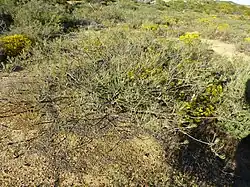 Melaleuca filifolia is usually a small, spreading shrub to 2 m (7 ft) high, sometimes to 4 m (10 ft). The leaves are arranged alternately on the stem, are circular in cross-section,10–35 mm (0.4–1 in) long and 2–4 mm (0.08–0.2 in) wide.
