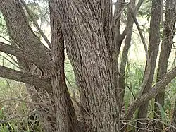 Melaleuca squamophloia was first named in 1997 by Lyndley Craven and Bryan Barlow in Novon.[4][5] It was first formally described in 1984 as Melaleuca styphelioides var. squamophloia by Norman Byrnes.[6] The specific epithet (squamophloia) is from the Latin word squama meaning "scale"[7]: 746  and the Ancient Greek word φλοιός (phloiós) meaning “bark”[7]: 123  referring to the bark of this species which is hard and scaly.[2]
