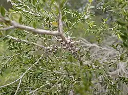 The flowers are white or cream-coloured and are arranged in spikes on the ends of branches which continue to grow after flowering and on the sides of the branches. Each spike contains 5 to 16 individual flowers and is up to 20 mm (0.8 in) in diameter. The petals are 1.5–1.8 mm (0.06–0.07 in) long and fall off as the flower opens or soon after. There are five bundles of stamens around the flower, each with 15 to 20 stamens. Flowering occurs in spring and from April to June, and is followed by fruit which are woody, almost spherical capsules, 2.5–3.5 mm (0.098–0.14 in) long.[2][3]
