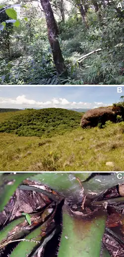 Habitat of M. xanthostomus: A = Type locality, a forest recovering from a fire a few years before; B = Cloud forest at Reserva Particular do Patrimônio Natural Caetezal; C = Terrestrial bromeliad where a male was calling.