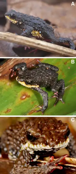 Adult males measure 16.9–21.5 mm (0.67–0.85 in)[1][4] and adult females 20.5–21.5 mm (0.81–0.85 in) in snout–vent length. The snout is short. No tympanum is visible. The fingers and toes are short, slightly webbed at the base, and with rounded tips. The hands and feet are red in ventral view. The dorsum is dark brown to black with a large yellow and white strip along the maxilla, extending up to the lower half of loreal region. There are yellow spots on chest and abdomen. Dorsal skin bears medium-sized, rounded glandular warts tipped with very few spines, while the venter is covered with medium glandular warts tipped with a spine.[1]