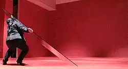In Suryodarmo's 2001 piece Lullaby for the Ancestors she repeatedly walks in a circle around a horse while cracking a whip then dunks her head in a bucket of water.[7] The work is based on Jaran Kepang, a traditional Javanese dance where the dancers enter a trance and endure physical trials.[8]