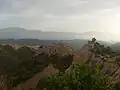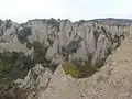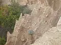 The area around Melnik is strikingly eroded, particularly the enormous area of cliff that serves as a backdrop to the town. This area, covering some 17 km2 near Melnik, Kurlanovo and Rozhen, has been called the Melnik Earth Pyramids or Melnik Badlands. The hills in this area can rise up to 100 metres (330 ft) high.[7] The unique formations, which can resemble giant mushrooms, ancient towers, and obelisks, were formed when heavy rain eroded the sand and clay the hills are composed of.[7]