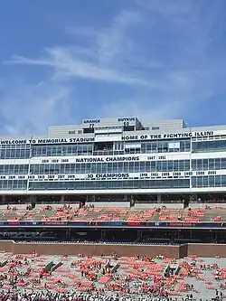 Memorial Stadium is a stadium on the campus of the University of Illinois Urbana-Champaign in Champaign, Illinois, United States. The stadium, used primarily for football, is a memorial to the university's students who died in World War I; their names are engraved on the nearly 200 pillars surrounding the stadium's façade.[5] With a capacity of 60,670, the stadium is primarily used as the home of the university's Fighting Illini football team.