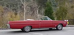 For the 1966 model year, the S-55 made its return as a stand-alone model (becoming the only S model to make a return). As in 1962, the model lineup consisted solely of two-door hardtops and convertibles. Again based on the Monterey, the S-55 featured a bucket-seat interior with a floor-mounted shifter and a higher-performance powertrain. Styling accents include unique body side-striping, deluxe wheel covers and the distinctive S-55 emblem on rear quarter panel and 428 V-8 emblem on the front fender sides. As with the previous generation the retail price and number of hardtops made was similar at US$3,292 ($31,904 in 2024 dollars [3]) with 2,916 sold.[1]