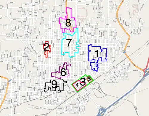 3  Meridian Downtown Historic District – runs from the former Gulf, Mobile and Ohio Railroad north to 6th St between 18th and 26th Ave, excluding Ragsdale Survey Block 71.