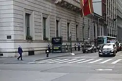The design of the courtyard may have been inspired by a similar courtyard that McKim, Mead & White designed for the Villard Houses.[188] The clubhouse's main entrance is on the western side of the courtyard,[196][203] while the entrance to the rear wing is on the eastern side. These entrances are accessed by sidewalks on either side of the courtyard.[203] There is a circular driveway in the courtyard, which originally allowed vehicles to drop passengers off at the clubhouse's porte-cochère.[204] As designed, the central carriageway measured 16 feet (4.9 m) wide and 25 feet (7.6 m) tall, while the pedestrian entrances measured 8 feet (2.4 m) wide and 20 feet (6.1 m) tall.[34][185][201] The ground story of the rear wing includes a niche, providing space for carriages within the courtyard to turn around.[200][203]