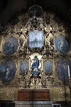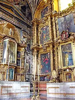 Additional sculptures were created by Sebastián de Santiago.[34] It takes its name from the statues of saintly royalty which form part of its decoration,[3] and is the oldest work in churrigueresque style in Mexico, taking 19 years to complete. At the bottom, from left to right, are six female royal saints: Saint Margaret of Scotland, Helena of Constantinople, Elisabeth of Hungary, Elizabeth of Aragon, Empress Cunegunda and Edith of Wilton.[35] In the middle of the altar are six canonized kings: Hermenegild, a Visigoth martyr; Henry II, Holy Roman Emperor; Edward the Confessor; and Casimir of Poland below, and Saints Louis of France and Ferdinand III of Castile above them. In between these kings an oil painting of the Adoration of the Magi by Juan Rodriguez Juarez shows Jesus as the King of kings. The top portion features a painting of the Assumption of Mary as celestial queen flanked by oval bas reliefs, one of Saint Joseph carrying the infant Jesus and the other of Saint Teresa of Ávila with a quill in her hand and the Holy Spirit above her, inspiring her to write.[36] In the upper part above this, there are angels carrying the attributes of the Virgin Mary such as the Sealed Fountain, the House of Gold, the Well of Living Water, and the Tower of David, and at the top is an image of God, the Father.[31]
