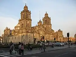 The Metropolitan Cathedral of the Assumption of the Most Blessed Virgin Mary into Heaven (Spanish: Catedral Metropolitana de la Asunción de la Bienaventurada Virgen María a los cielos), also commonly called the Mexico City Metropolitan Cathedral, is the cathedral church of the Catholic Archdiocese of Mexico.[2] It is situated on top of the former Aztec sacred precinct near the Templo Mayor on the northern side of the Plaza de la Constitución (Zócalo) in the historic center of Mexico City. The cathedral was built in sections from 1573 to 1813[3] around the original church that was constructed soon after the Spanish conquest of Tenochtitlan, eventually replacing it entirely. Spanish architect Claudio de Arciniega planned the construction, drawing inspiration from Gothic cathedrals in Spain.[4]
