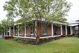 By June 1866, the house was known as "Middenbury".[26] The source of the name has not been verified; one suggested link is the suburb of Midanbury, in Southampton, England, which took its name from a large house Middenbury, built in the 1700s.[27] Both Lewis and Eliza Rogers' name appear in notices related to Middenbury from the time of its completion, and the house appears to have been used as residence by both members of the family. Middenbury was let out for a few months in both 1868 and 1869; at this time it was identified as the house of Eliza Rogers.[28][29][30][31] In 1874, 1 rood 37.25 perches (1,954 m2) of the Middenbury property was acquired by the Commissioner of Railways for the railway extension to Brisbane from Ipswich.[32][33] An 1875 survey map conducted as part of this process shows Middenbury with verandahs on its northeast and southeast elevations, with the rear of the house flanked by service wings, and a building on the site of the stables.[1][34]