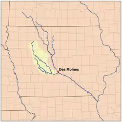 The Raccoon River is a 30.8-mile-long (49.6 km)[4] tributary of the Des Moines River in central Iowa in the United States. As measured using the longest of its three forks, its length increases to 226 miles (364 km).[4] Via the Des Moines River, it is part of the watershed of the Mississippi River. The river runs through an intensely cultivated area of croplands and livestock farming, receiving Tile drainage from slow-draining rich natural bottomland.