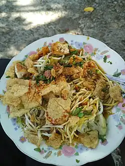 Mie kopyok (lit.'shaken noodle'), is an Indonesian noodle soup, a specialty of Semarang City, Central Java. The dish consists of noodles served in garlic soup, slices of fried tofu, lontong, bean sprouts, and crushed crackers, sprinkled with sliced fresh celery, and fried shallot. It is served with kecap manis on top.[1] Mie kopyok was mostly peddled with pushed food carts from one sub-district to another, but now, it can be found in the downtown of Semarang with a permanent building.