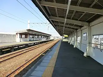 The station has two elevated side platforms, with the station building located underneath. However, the platforms are not matched. Platform 1 can handle a full train of 10 carriages, but Platform 2 is short and can accommodate only four carriages in length. The station building has automated ticket machines, TOICA automated turnstiles and is staffed.