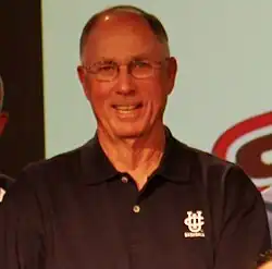 Gillespie also played baseball at USC under coach Rod Dedeaux, and was a member of the 1961 College World Series champions. Along with Jerry Kindall, he is one of only two individuals who have both played for and coached a College World Series champion.[5] He was succeeded as USC's head coach by Chad Kreuter, a former major league catcher who is married to Gillespie's daughter Kelly.[6][7]