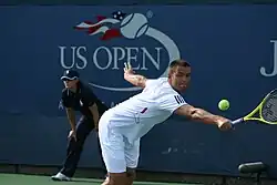 Youzhny started the 2010 season by pulling out of the third round of the Australian Open with a wrist injury.[44] In the first round, he beat Richard Gasquet after being down 2 sets to 0. He beat Jan Hájek in the second round.[45] After the recovery, he made the final at the ABN AMRO World Tennis Tournament in Rotterdam, worth 500 ATP points.[45] Notably, he stunned top-seeded Novak Djokovic in two tiebreaks in the semifinal.[45] In the final, he trailed behind world number eight Robin Söderling 4–6, 0–2 before retiring, due to a right hamstring injury.[46] In his next tournament, he reached his second successive final at the Dubai Tennis Championships. En route to the final, he beat Lukáš Lacko, Björn Phau, Janko Tipsarević, and Jürgen Melzer.[45] In the final, he lost to world number two seed Novak Djokovic (the defending champion). It was Youzhny's fourth consecutive final loss in an ATP 500 event.[47] He reached the quarterfinals of the Sony Ericsson Open in Miami, losing to world number seven Robin Söderling.[45] On his third final appearance, Youzhny defeated world number eleven Marin Čilić to win his first BMW Open in Munich, Germany.[48] Youzhny entered the French Open as the 11th-seed, and reached the quarterfinals for the first time by defeating world number ten Jo-Wilfried Tsonga when Tsonga retired in the second set.[49] Youzhny lost to Tomáš Berdych, the 15th-seed.[50] Seeded 13th, Youzhny lost a tough five-setter to resurgent Paul-Henri Mathieu in the second round of Wimbledon.[51] At the Allianz Suisse Open Gstaad in Switzerland, Youzhny lost to world number 147 Yuri Schukin from Kazakhstan.[45] Youzhny, seeded 14th, reached the semifinals of the US Open for the first time since 2010, but lost to world number one Rafael Nadal. Because of his performance at the US Open, Youzhny reentered the top 10 for the first time since 2008.[6] Youzhny, in his first tournament since the US Open, won his second title of the year by defeating world number forty-one Andrey Golubev at the Proton Malaysian Open.[52] Following his victory, Youzhny reached a career-high ranking of world number eight.[6] He was forced to withdraw from the Kremlin Cup, in which he was the defending champion, due to a viral illness.[53] At his next tournament, the St. Petersburg Open, Youzhny reached the final, but lost to world number eighty-eight Mikhail Kukushkin from Kazakhstan.[54] Youzhny's season ended when he was forced to retire with a back injury against world number twenty-six Ernests Gulbis at the BNP Paribas Masters in Paris.[55] By retiring, Youzhny lost his last chance to qualify for the Barclays ATP World Tour Finals.[55] For the first time in his career, Youzhny finished the year as world number ten and as the highest-ranked player from Russia.[15] He ended the year with a 43–19 win–loss record,[45] 2–4 against top ten opponents and earning a career high of $1,900,349 in prize money.[15]