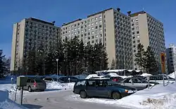 Mikontalo was built during the period 1978–1980.[1] Representing brutalism, it consists of 4 blocks with 12 floors where 767[2] dwellings are situated. Mikontalo offers for its inhabitants saunas (two per building), a free gym, public lounge with a TV-set, Nintendo Wii, Soundsystem, board games, coffee machine and microwave; laundry room (5 washing and 2 drying machines), cable TV, and connection to the Internet.[1]