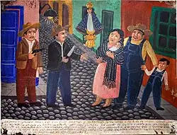 The text that is painted beneath this ex-voto tells of the Gonzalez family, who were on the streets one night and were attacked. But, thanks to the Virgin of San Juan de los Lagos (whose image in the painting floats between the family and their assailants) they escaped unharmed. Our Lady of San Juan de los Lagos is venerated in the region of central Mexico where the depicted incident occurred. The ex-voto is dated August 28, 1947, San Juan de los Lagos.