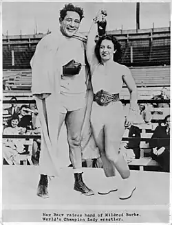 Prior to wrestling, she was an office stenographer by day, had outstanding muscle development, and was hoping to become a professional wrestler.[6]: 290  Locally, Billy Wolfe was training aspiring women professional wrestlers. At first, Wolfe did not want to train Burke and instructed a male wrestler to body slam her, so she would stop asking Wolfe to train her. Burke, however, performed a body slam on the man instead, which resulted in Wolfe agreeing to train her.[7]: 44–45  Wolfe tutored her and realized that she was the prospect for which he was waiting. The close proximity of their training resulted in a relationship and ultimately marriage. Changing her name to Mildred Burke, she defeated Clara Mortensen for the Women's World Championship in January 1937.[6] During this time, Burke was mentored by Cora Livingston.[8]