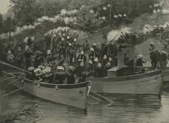 On 11 November, Stewart's force landed at Barra Point, consisting of 451 of all ranks. They were supported with heavy cover fire from the Plumper (under Lieutenant Cresey), the Parmilia, and an armed colonial schooner. The Mandinkas were estimated at 2500-3000 strong and were skilfully covered from the gunfire by their entrenchments and by the shelter of the high grass. They sustained heavy fire upon Stewart's force who were landing directly in their front. Despite this, the British pushed on, and after an hour's hard fighting, during which the Mandinkas contested every inch of ground, they succeeded in driving them from their entrenchments at bayonet point and pursued them for some distance through the bush. The British lost two men in this action, with three officers and 47 other ranks wounded. Over the next few days, the British focused on landing the guns and placing Fort Bullen in a state of defence. At daybreak on 17 November, the British marched to attack Essau, leaving Fort Bullen in the charge of the crew of the Plumper.[1]