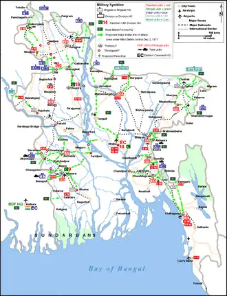 The DMO had assumed that India did not have adequate forces to liberate Dhaka within the allotted time span, so the objective was to liberate the maximum amount of territory.[59] Since this plan did not assumed India attacking with a 3:1 advantage in numbers against the assumed 4 Pakistani infantry divisions in Bangladesh, Gen. K.K Singh envisioned the Mukti Bahini helping to fill the gap in strength as follows: