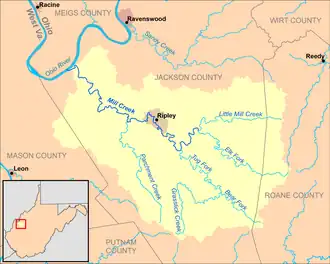 Mill Creek flows generally west-northwestward in a winding course through central and western Jackson County, through the city of Ripley, which may have been named for Harry Ripley, a traveling preacher said to have drowned in the creek in 1830.[9] Downstream of Ripley, the stream passes through a broad valley in the vicinity of the community of Cottageville[10] and flows into the Ohio River at the community of Millwood.[7] Approximately the lowermost 6 miles (9.7 km) of the stream consists of backwater caused by damming of the Ohio.[10] A commercial port facility is located on the creek near its mouth, handling limestone, sand, gravel, aluminum, and salt.[11]