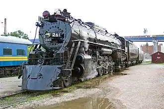 In June 1995, No. 261 hauled a one-way excursion, sponsored by Trains Magazine, over five days from Minneapolis to Scranton, Pennsylvania, where it participated in Steamtown National Historic Site's grand opening celebrations the following month.[3][4] Originally, it was supposed to doublehead with Pere Marquette 1225 from Michigan through Canada and into New York state, before continuing south.[3][5] While No. 261 was in Chicago, the doubleheader was cancelled due to routing issues. No. 261 operated on an alternative route over CSX into Pennsylvania and heading to New York via the Buffalo and Pittsburgh Railroad, while No. 1225 remained in Michigan.[3][5] The 4-8-4 stayed for one year in Scranton, pulling numerous excursions, including rare-mileage trips, a rare snowplow run, and a doubleheader excursion with New York, Susquehanna and Western 142 between Scranton and Syracuse, New York.[6][7] A Hancock 3-chime whistle was temporarily added to the locomotive and then replaced with an AT&SF 6-chime whistle, which remains on it today, but still also keeping its original non-Hancock 3 chime whistle and Leslie A-125 air horn. In early 1996, No. 261 returned to the Midwest. On its way home, the locomotive made its first runs over the newly formed BNSF Railway. It pulled a few sets of excursions in 1997 and 1998 over BNSF and TC&W trackage.