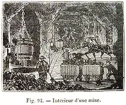 A mine railway (or mine railroad, U.S.), sometimes pit railway, is a railway constructed to carry materials and workers in and out of a mine.[1] Materials transported typically include ore, coal and overburden (also called variously spoils, waste, slack, culm,[2] and tilings; all meaning waste rock). It is little remembered, but the mix of heavy and bulky materials which had to be hauled into and out of mines gave rise to the first several generations of railways, at first made of wooden rails, but eventually adding protective iron, steam locomotion by fixed engines and the earliest commercial steam locomotives, all in and around the works around mines.[3]