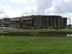 The mining of bauxite in Suriname has been known since 1915 and its export dates back to 1922, with the start of its exploitation by the American company Alcoa.[26] Suriname's production was 280,000 tonnes, on average, before 1939, and it reached 2,699,000 tonnes in 1951, eight times more, then 3,421,000 in 1954 and 3,377,000 in 1957.[27] The strategic nature of this resource allowed Suriname to benefit from the protection of the United States during World War II, and to attract investments from large companies such as Shell, BHP and Alcoa.[26]