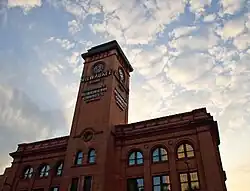 Originally, the facility's most distinguishing feature, the clock tower, was pinnacled and modeled after the Giralda in Seville, Spain; high winds destroyed the pinnacle in 1941 and the tower has since had a flat top.[5]