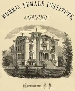 In 1860, the school building was incorporated as the Morris Female Institute, and organized in 1861.[2] The school was religiously affiliated with Presbyterianism, and its principal was Professor Charles G. Hazletine.[4][5] Hazletine, a former schoolteacher, published articles in the New York Tribune circa 1839.[6]