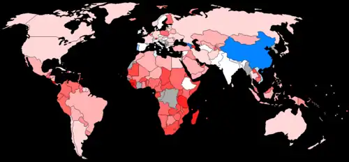 According to Amartya Sen, even though women make up the majority of the world's population, the proportion of women in each country's population varies drastically from country to country, with various countries having fewer women than men.[2] This runs contrary to research that females tend to have better survival rates than males, given the same amount of nutritional and medical attention.[22] To capture this divergence from natural sex ratios, the count of "missing women" is measured as a comparison of a country's male-to-female (or female-to-male) sex ratio compared to the natural sex ratio. Unlike female mortality rates, estimates of missing women include counts of sex-specific abortions, which Sen cites as a large factor contributing to the disparity of sex ratios from country to country.[2] Furthermore, female mortality rates fail to account for intergenerational effects from female discrimination, while a comparison of a country's sex ratio to natural sex ratios would.[3]