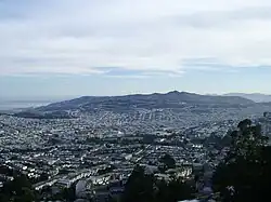 The Twin Peaks, icons of the San Francisco Bay Area, are also home to a reported population of Mission blue butterflies. The entire area is a park managed by the San Francisco Recreation & Parks Department (SFRPD). The park contains 31 acres (130,000 m2) of what the Park Department terms "Natural Areas." This area is most of the park minus roads, viewpoints and the City Fire Department reservoir. The natural areas contain significant resources for preservation. They include some of the largest areas of coastal scrub and prairie that remains within the city of San Francisco. These, being the preferred habitat of the Mission blue, are areas that support and provide habitat for the butterfly. Twin Peaks receives heavy recreational use because of its picturesque view of the city. Twin Peaks supports a wide array of habitat types, from mixed forest to coastal scrub. Among the coastal scrub and prairies are silver bush lupine plants (L. albifrons) which support the colonies of endangered Mission blues.[14]