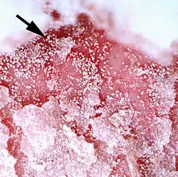 Sarcoptic mites as adults are microscopic, nearly circular in outline, and their legs are short, adapted for burrowing.[30] The females, after mating with males on the surface of their host's skin, burrow into the living layers of the epidermis (mainly the stratum spinosum). They make tunnels horizontal to the surface of the skin. Here, eggs are laid and development of larvae and nymphs occurs. The mites have low mobility and transmission between hosts occurs only during close contact.[31] The feeding of the mites and their excretory products irritates and inflames the skin, causing intense pruritus. Dermal hypersensitivity reactions develop in the host. Chronic infestations lead to thickening of the skin by overproduction of epidermal cells (acanthosis), resulting in a characteristic depilated and scaly appearance. Stress caused by the pruritus can be severe, and will result in 6% to 23% lost productivity of commercially reared pigs.[32][33] Camels are prone to severe infestation with Sarcoptes.[34]