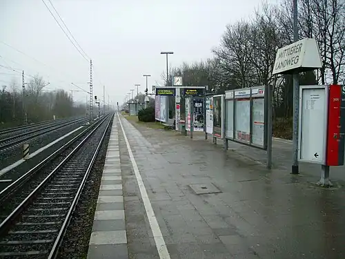 Mittlerer Landweg is a station on the Berlin-Hamburg railway line and served by the trains of Hamburg S-Bahn line S2. The station was originally opened in 1842 and is located in the Hamburg district of Billwerder, Germany. Billwerder is part of the Hamburg borough of Bergedorf.