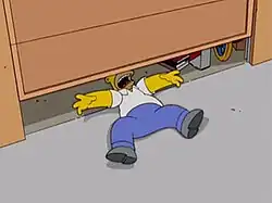 ![]() Homer getting crushed by the door of the garage while trying to clean it up. This scene was inspired by a real-life event of writer John Frink. | |