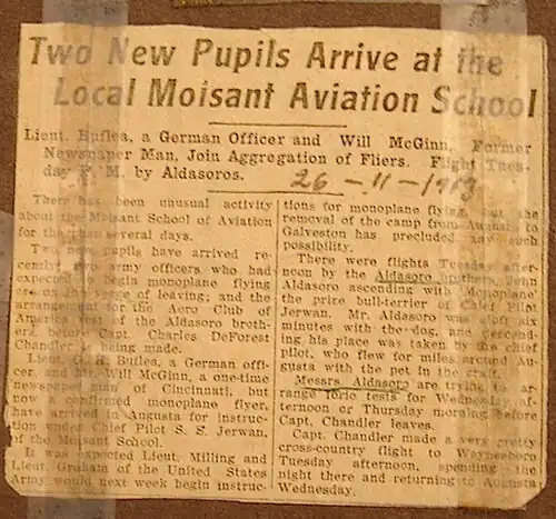 Newspaper clipping from 26 February 1913 describing the arrival of two new pupils, the Aldasoro Brothers, to the Moisant Aviation School