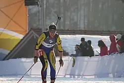 In the men's events, debutante and flag-bearer Victor Pinzaru finished 70th in the sprint event and 85th in the individual event.[16][14][15] In the women's events, Levtchenkova, who represented Moldova for the second consecutive Winter Games, participated in all three of the women's individual medal events.[17] She is a Russian born athlete, who became a naturalized citizen of Moldova and won the Biathlon European Championships in 2008.[8][18] In the medal events, Levtchenkova registered her best finish in the women's individual event, finishing 36th amongst the 87 participants.[19]
