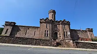 The prison in Pottsville, with a state historical marker for the Molly Maguires execution visible near the entrance