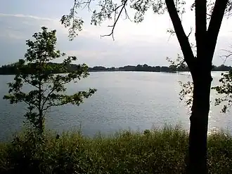 Much of Monson Lake State Park's acreage is water, with land mostly comprising isthmuses between, and islands in, the three adjacent lakes of Monson, West Sunburg, and East Sunburg. Monson Lake, whose shore forms the western boundary of the park, is 152 acres (62 ha) and up to 21 feet (6.4 m) deep.[4] West Sunburg Lake is about 178 acres (72 ha).[3]: 26  Monson Lake has three inlets, and one outlet to West Sunburg.[4] The lakes are part of the watershed of the Chippewa River, a tributary of the Minnesota River.[3]: 24