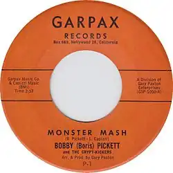 "Monster Mash" is a 1962 novelty song by Bobby "Boris" Pickett. The song was released as a single on Gary S. Paxton's Garpax Records label in August 1962 along with a full-length LP called The Original Monster Mash, which contained several other monster-themed tunes. The "Monster Mash" single was number one on the Billboard Hot 100 chart on October 20–27 of that year, just before Halloween.