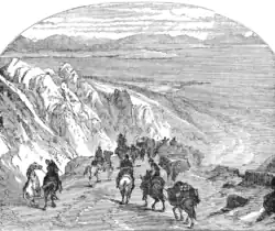 Immigrants came to Montana in wagons, on horseback, and by foot. They were also able to take steamboats up the Missouri River to Fort Benton during high water months.[2] From there, however, travelers had to take stagecoaches or wagons to the mining camps.[2] Fort Benton boomed as a transportation hub during the high-water months.[2] Many people traveled over overland trails because they were much cheaper than traveling by steamboat. However, this journey was much more difficult. People used pack trains, mule trains, and oxen on the trails.[2]