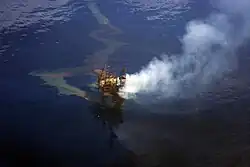 On 1 November 2009, during an attempt to stop the leak, a fire broke out on the West Atlas drilling rig.[15] On 2 November, PTTEPAA said that the fire appeared to be burning off the oil and thereby preventing further leakage into the sea.[16] The fire was largely extinguished when the leak was stopped.[2][17] Once safety criteria were met, a specialist team boarded the Montara wellhead platform and the West Atlas to assess the damages.
