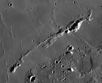 The selenographic coordinates of this range are 29°04′N 54°04′W / 29.06°N 54.07°W. It continues for a distance of 160 kilometres. This range is a long, slender ridge formation that is more rugged at the northeastern end. There is also a rise at the southwest terminus of the range. The faint trace of a ray parallels the range just to the north. The 20 km gap between this range and the plateau to the south is covered by a flow of basaltic lava. There is a small wrinkle ridge near the northern part that is identified as Dorsum Niggli.